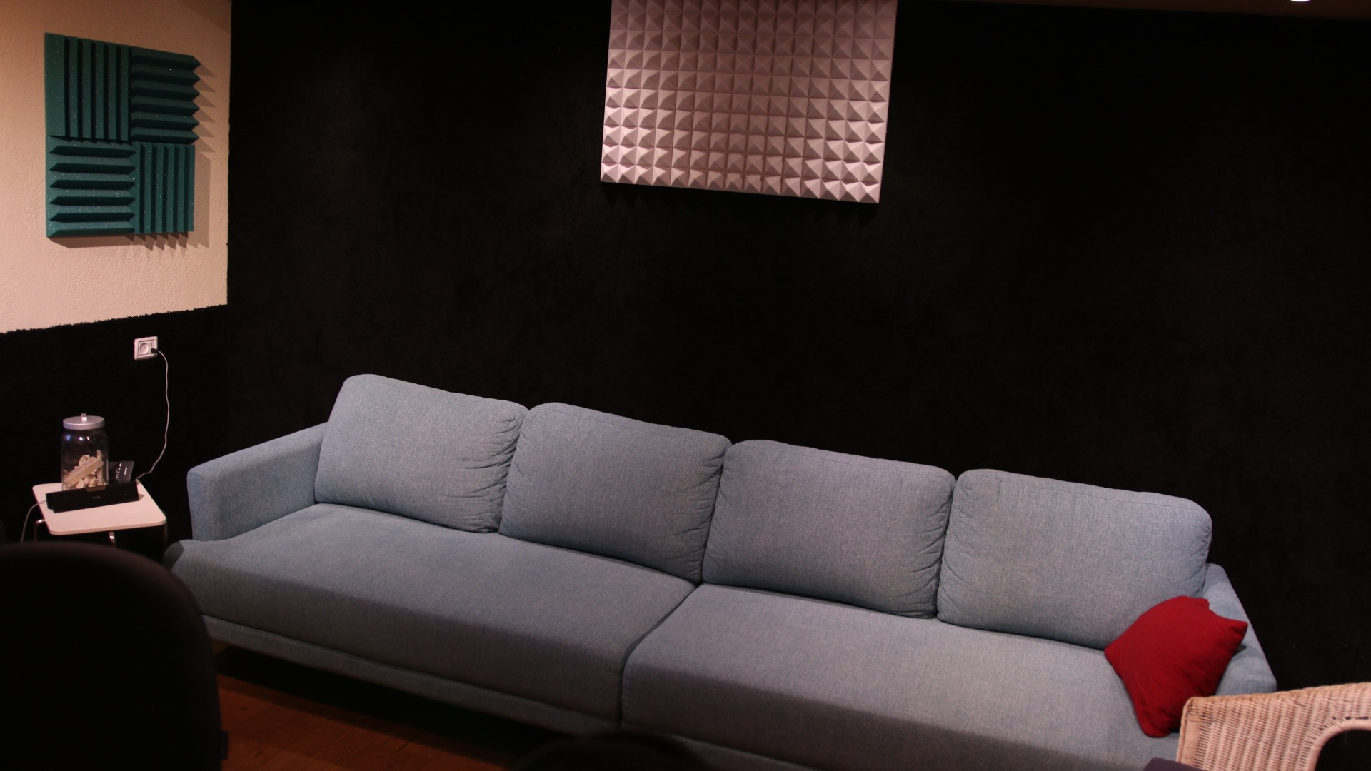 1 - חדר הקלטה אקוסטי ממוזג, מבודד בספוגים צבעוניים נעימים לעין, המסוגל בקלות להכיל קבוצה של אנשים שרה יחד.